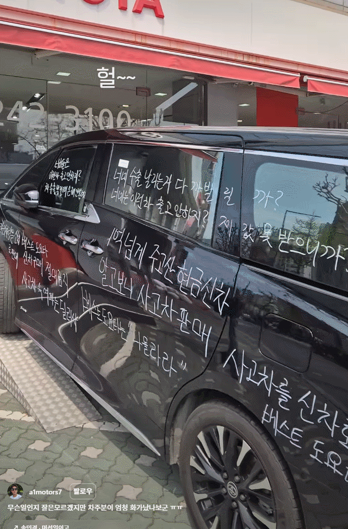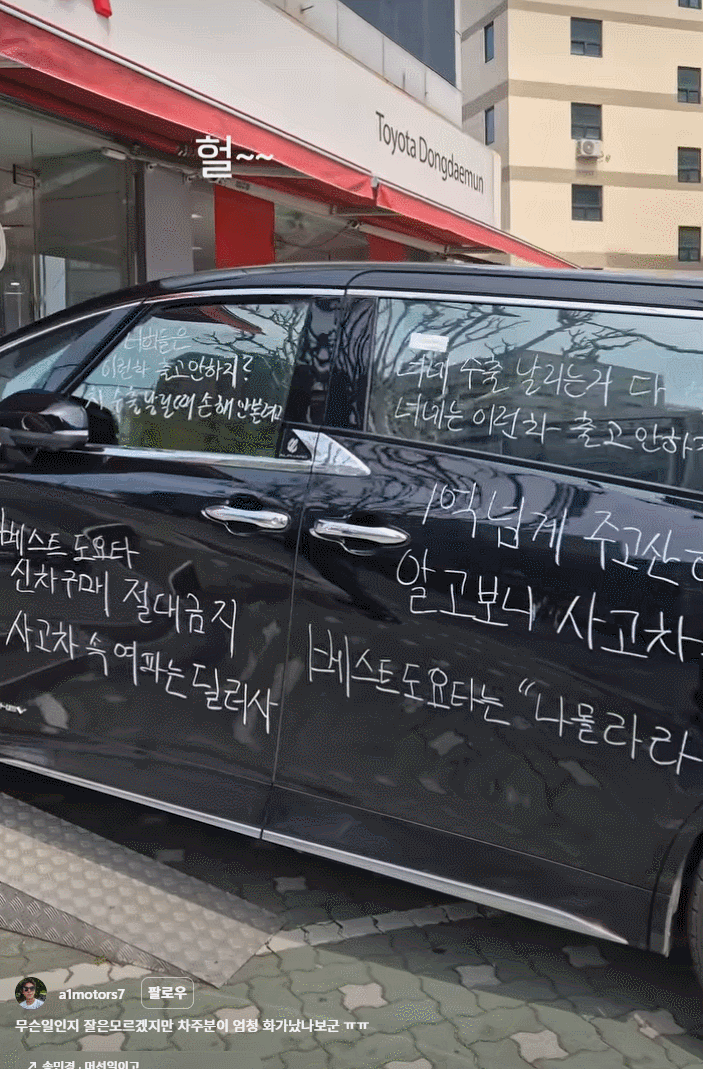 베스트도요타는 "나몰라라" 와 같은 문구가 써진채로 도요타 매장 앞에 주차되어 있습니다.