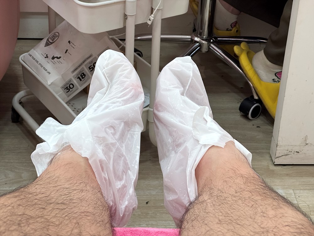 그라인더 같은걸로 발 뒷꿈치 각질을 한참 제거한 뒤에 젤 같은걸 바르고 이렇게 묶어 두었습니다. 안에서 촉촉한게 기분이 좋습니다!
